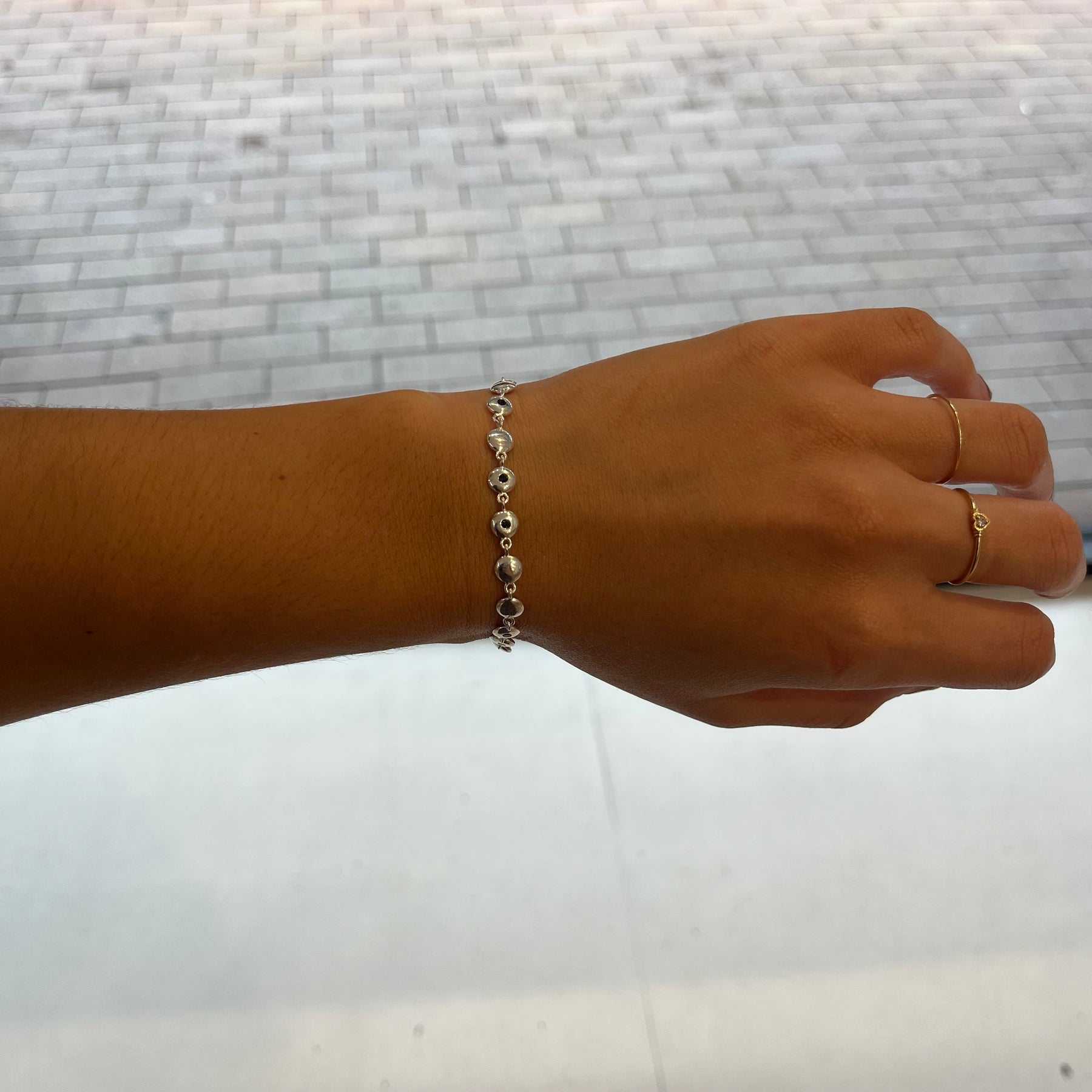 Linked in a fluid sequence, each element moves with the wearer, while the teal gemstones embody the bracelet's Turkish name meaning "blue".