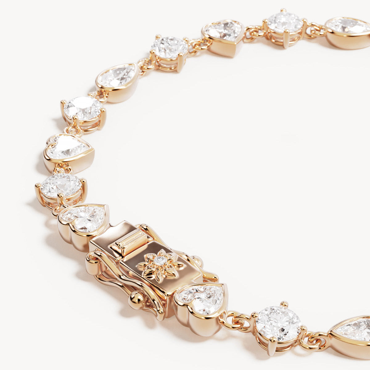 Tennis bracelet design that features alternating heart cut crystals in a bezel setting and round cut cubic zirconias in a claw setting.