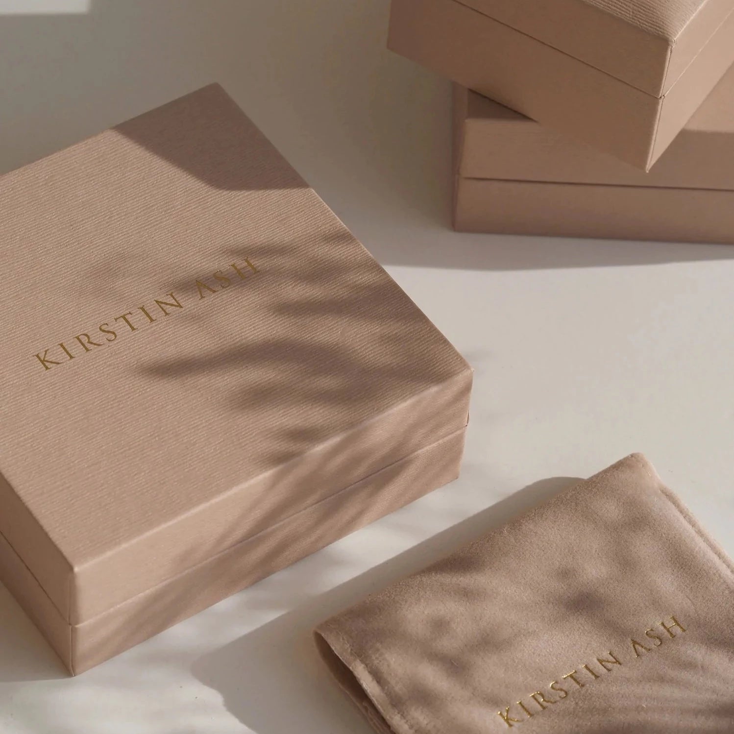 Presented in a pretty Kirstin Ash pouch and box. The boxes are made from 100% recycled card and paper with eco-friendly inks and the soft, reusable vegan suede travel pouch is designed to carry and protect your jewellery.