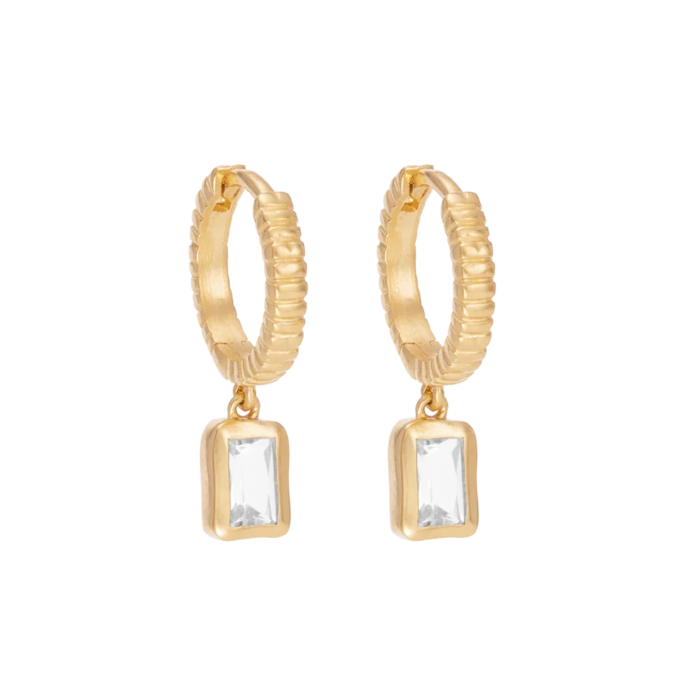 Highlighting the ebb and flow between light and shadow, the Sierra Hoops feature a baguette-cut bezel set white topaz stone, with textural hoop detail. A modern take with an organic finish.