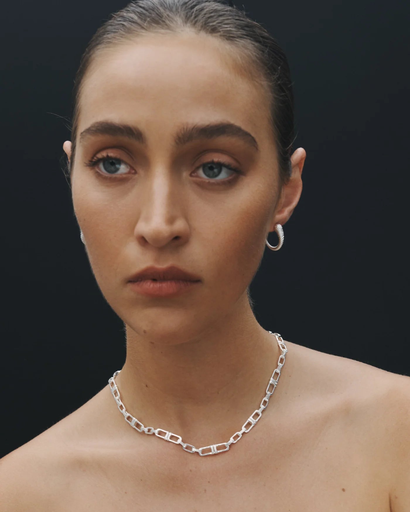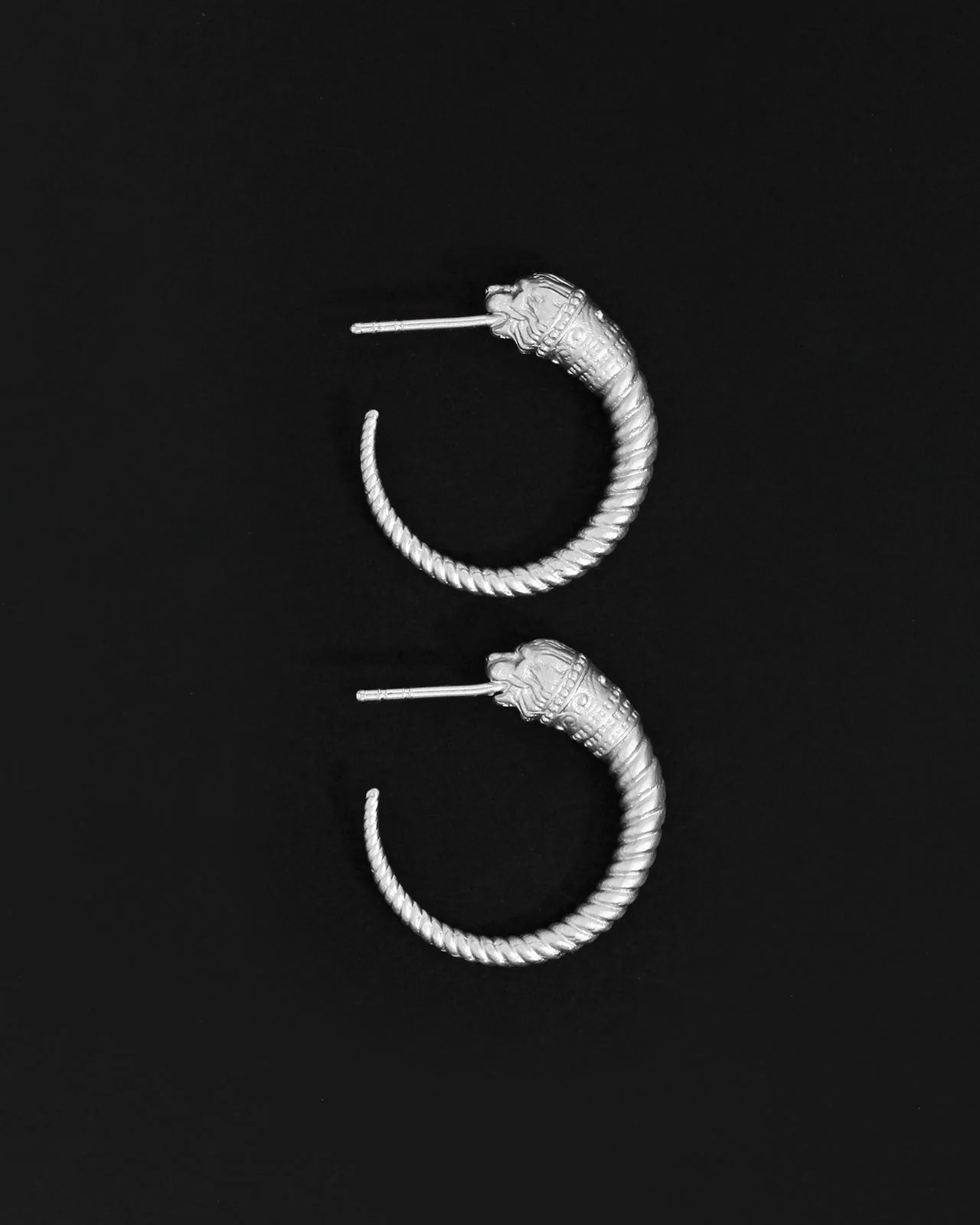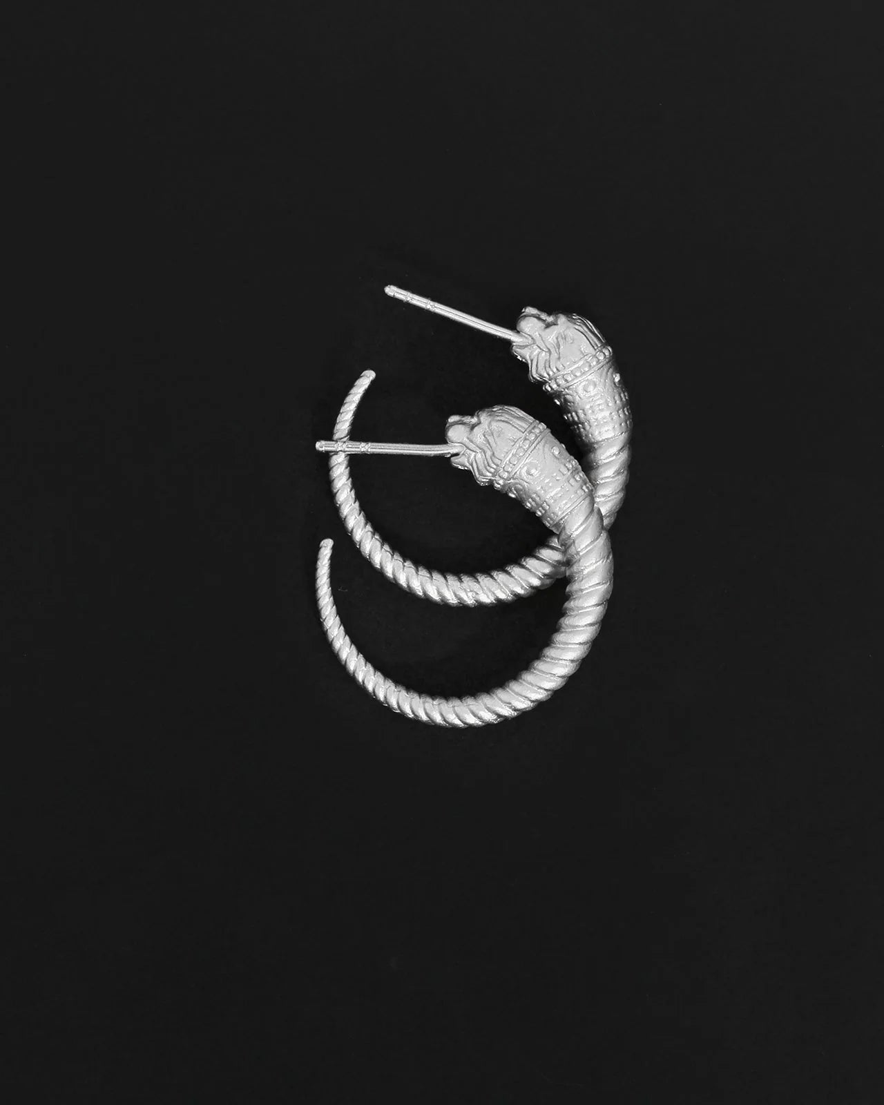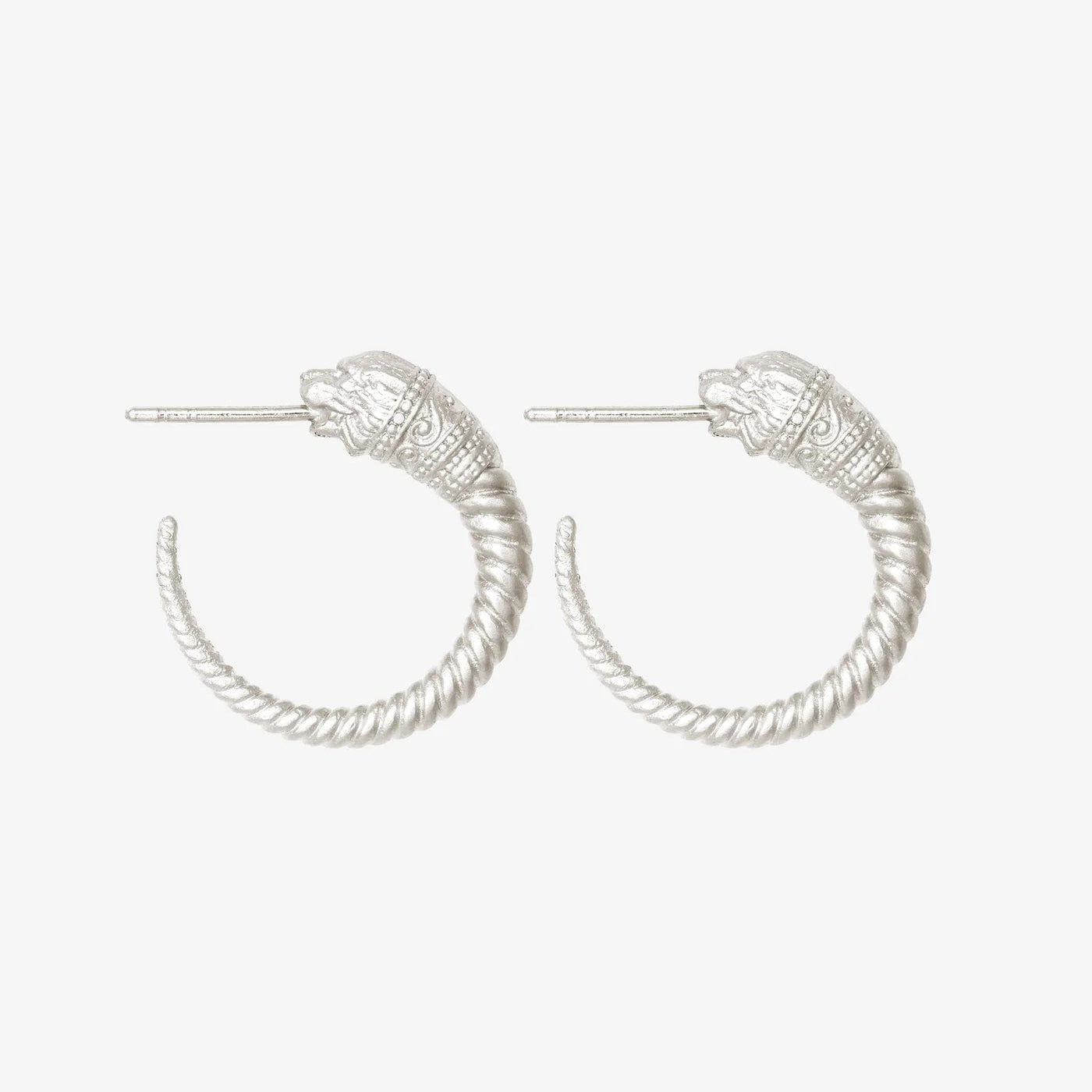The Loulon Lion Hoops, in recycled sterling silver, combine a spiralling helix design with sculpted lion heads, long regarded as symbols of strength and protection.