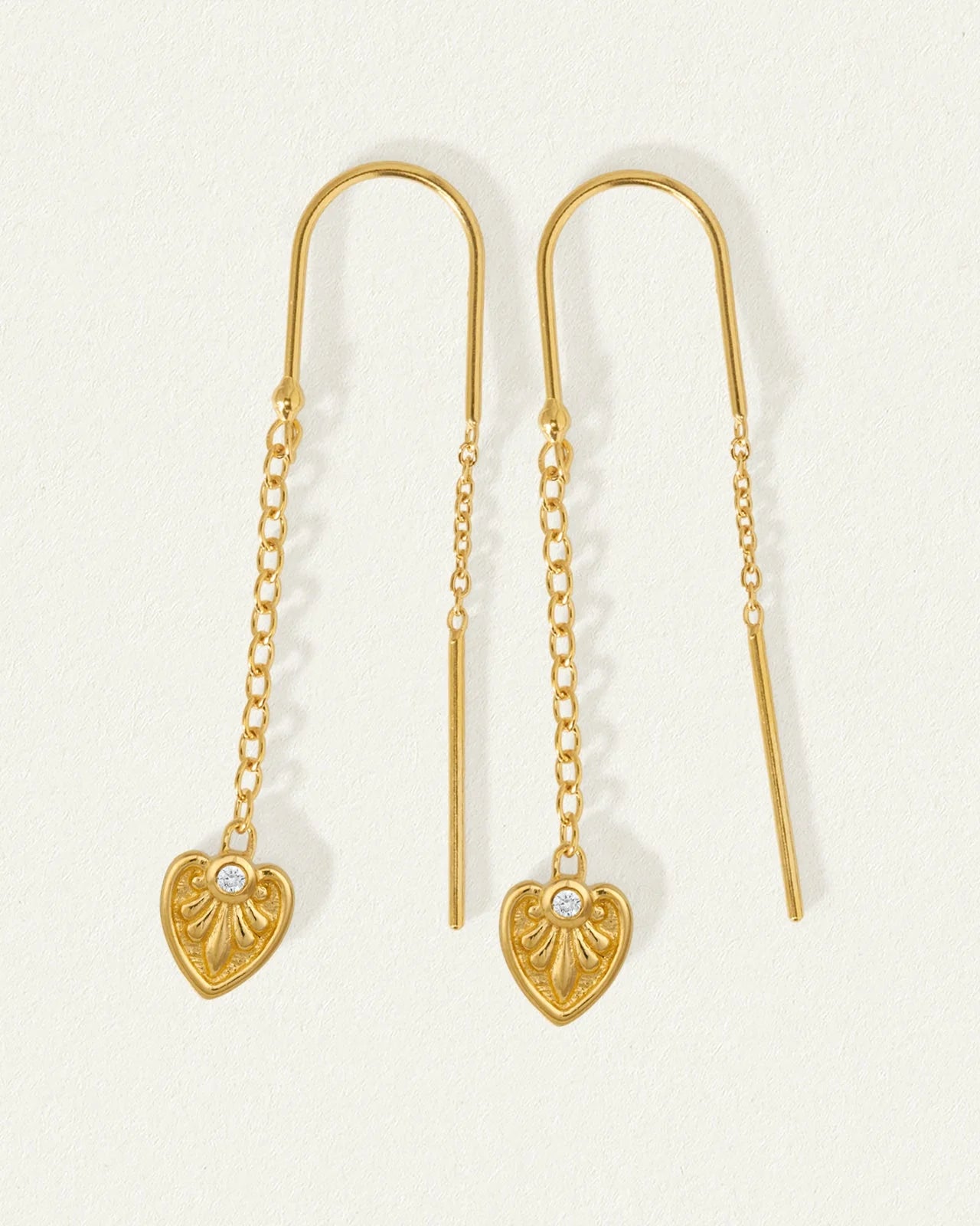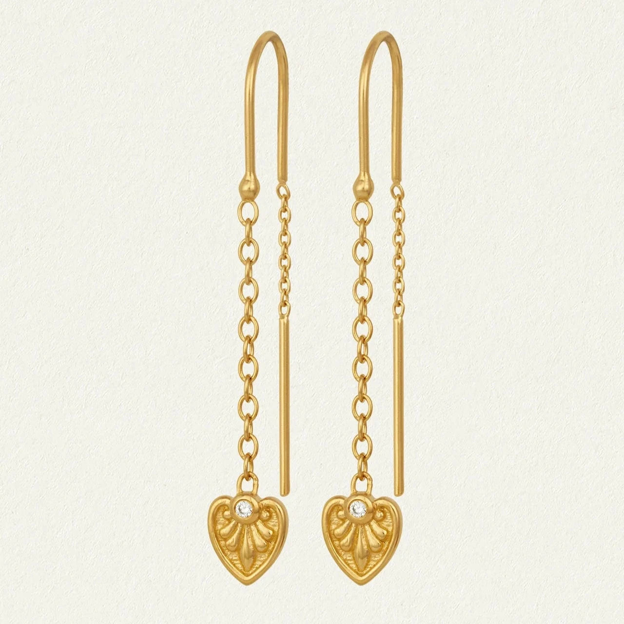 18k gold vermeil threader earrings featuring heart-shaped pendants suspended from a fine chain, secured by a curved bar. The Silph Earrings are set with petite lab diamonds, symbols of eternal love.