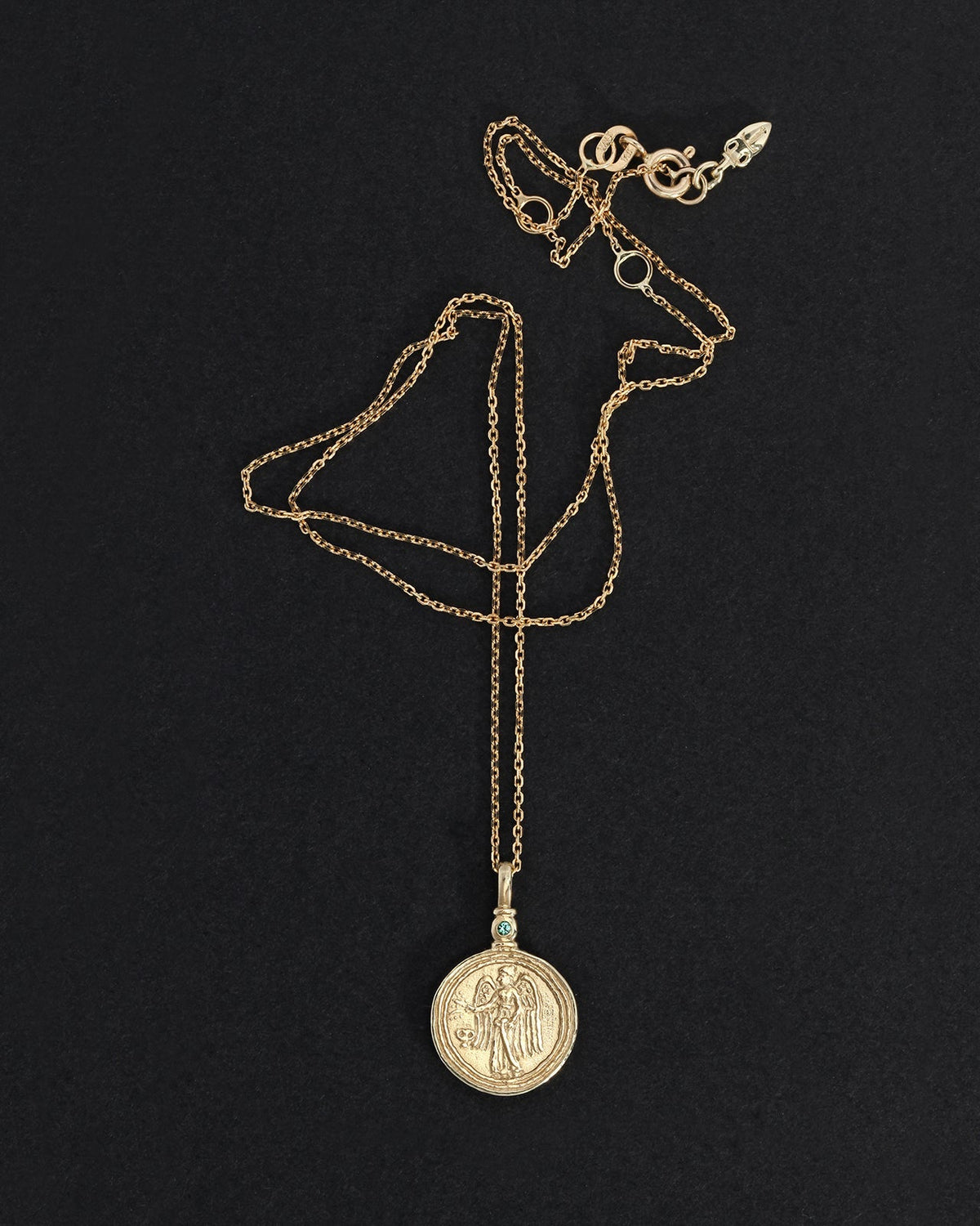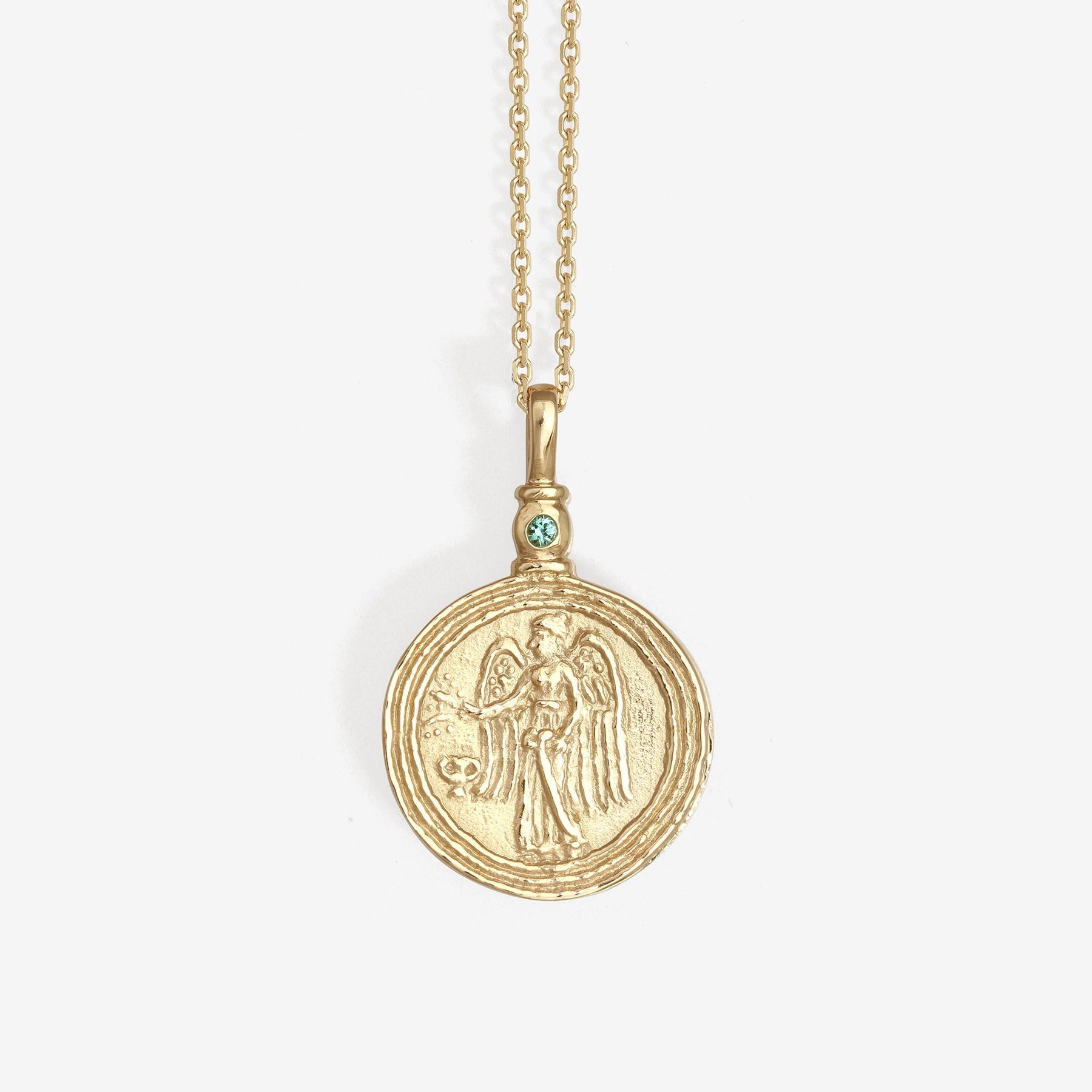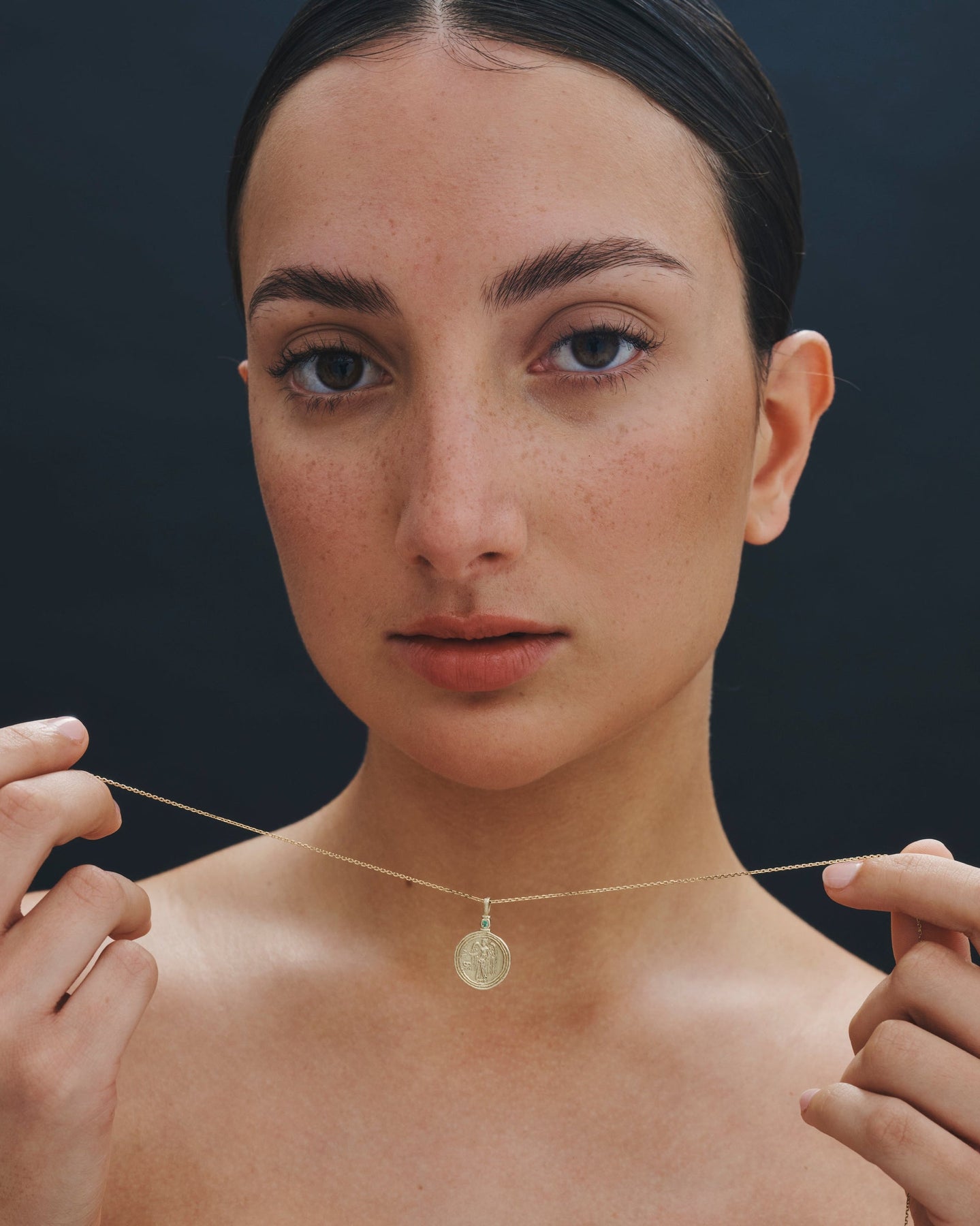 The Serafina Coin Necklace features a finely detailed coin pendant suspended from a diamond-cut cable chain, with a round brilliant-cut emerald set into the bail.