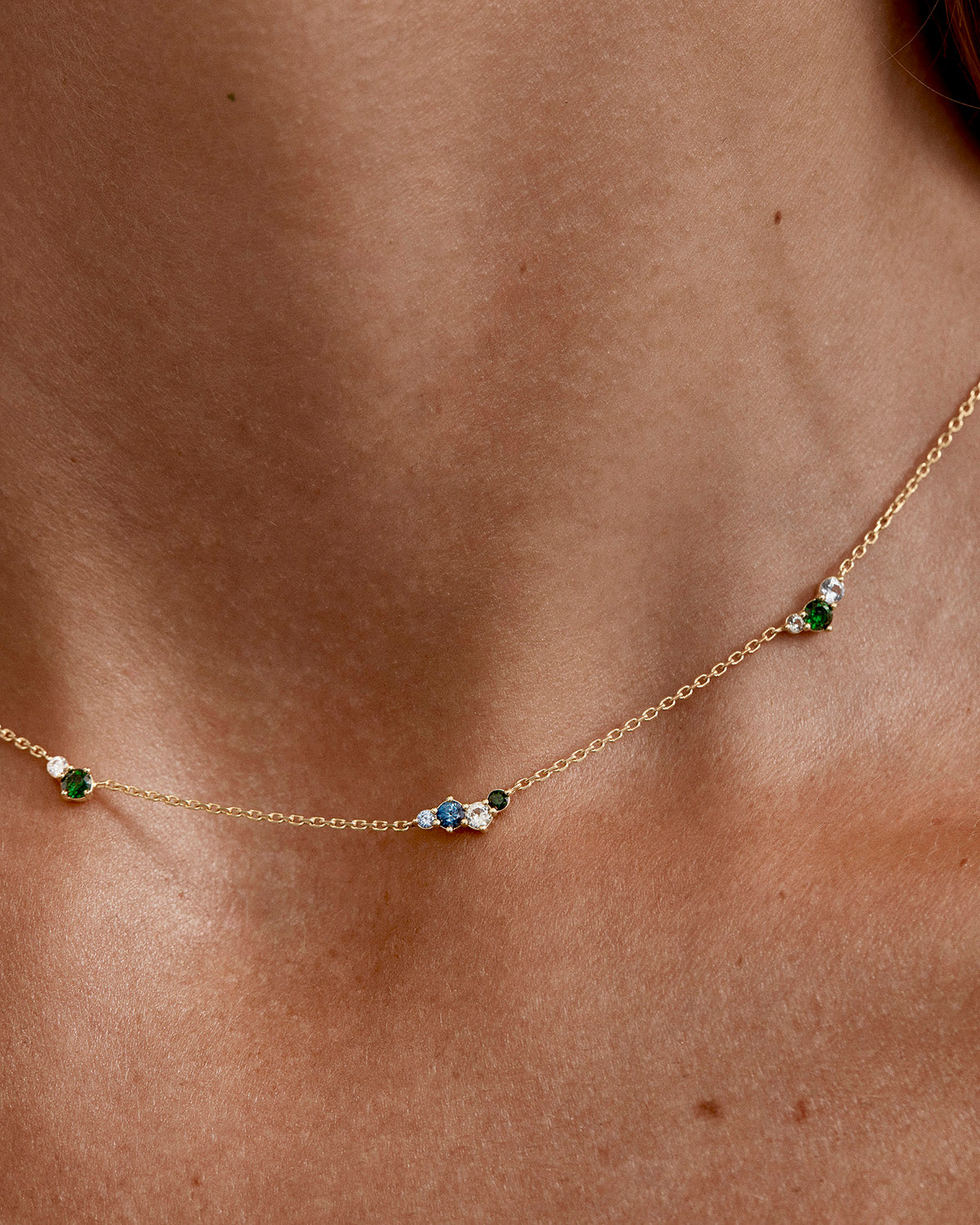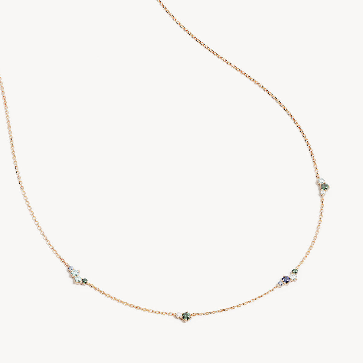 Delicate layering choker featuring a cluster of blue-green hued gemstones in a claw setting.