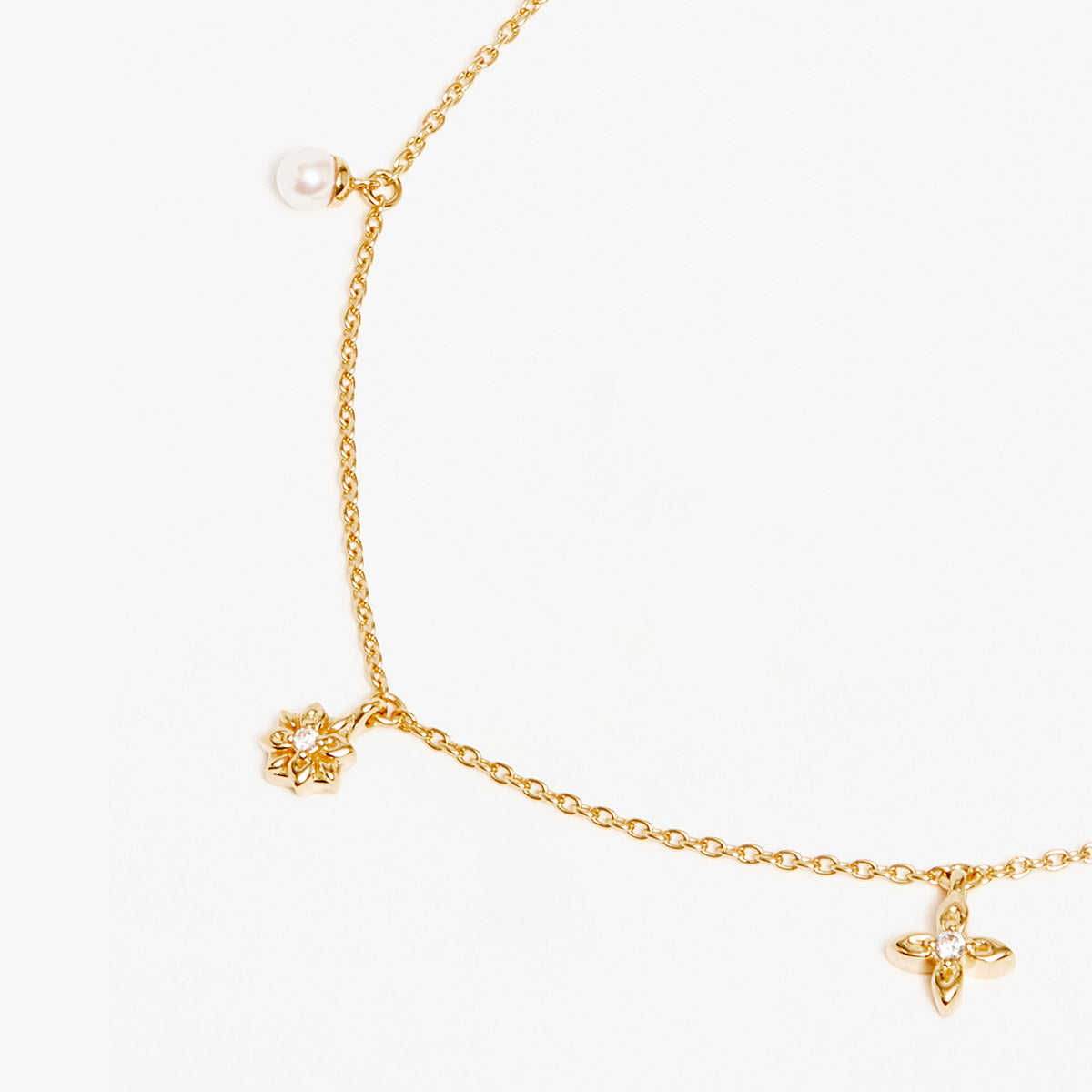 Features a 3.5mm round freshwater pearl, 5mm baroque freshwater pearl, 5.5mm and 6.5mm lotus pendants, and 2.5mm ball detail.