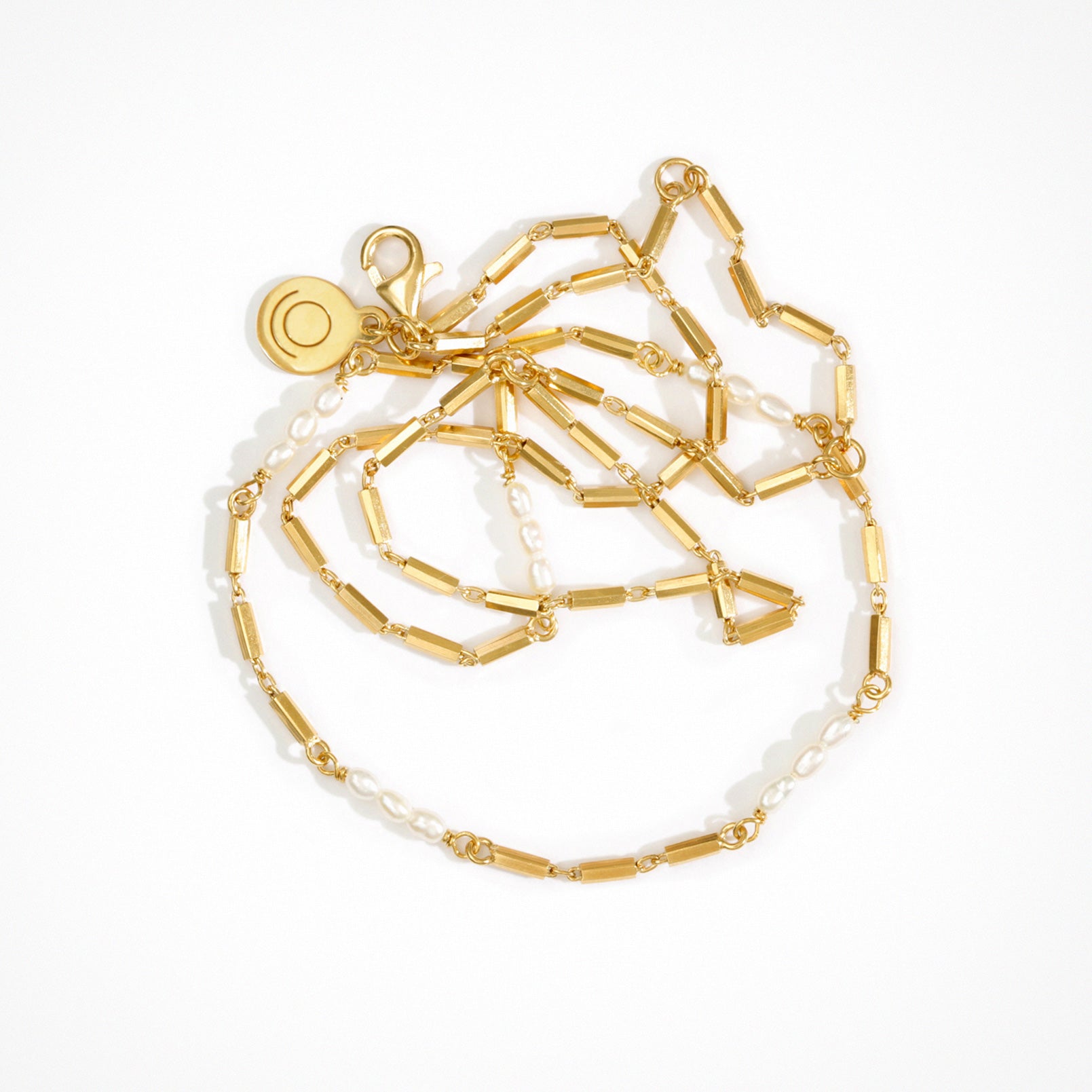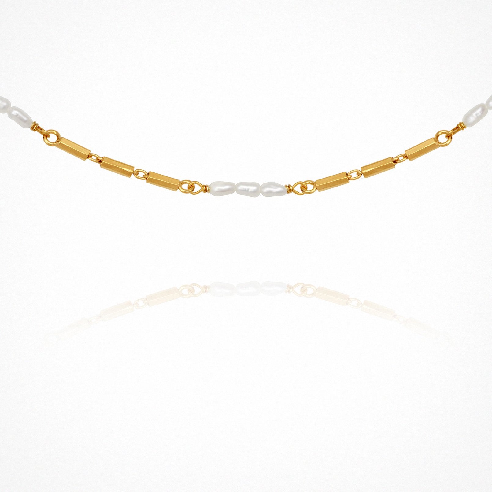 The Temple of the Sun Riviera Necklace Pearl in 18K Gold Vermeil is a delicate cane cable chain with five groups of freshwater white pearl beads.