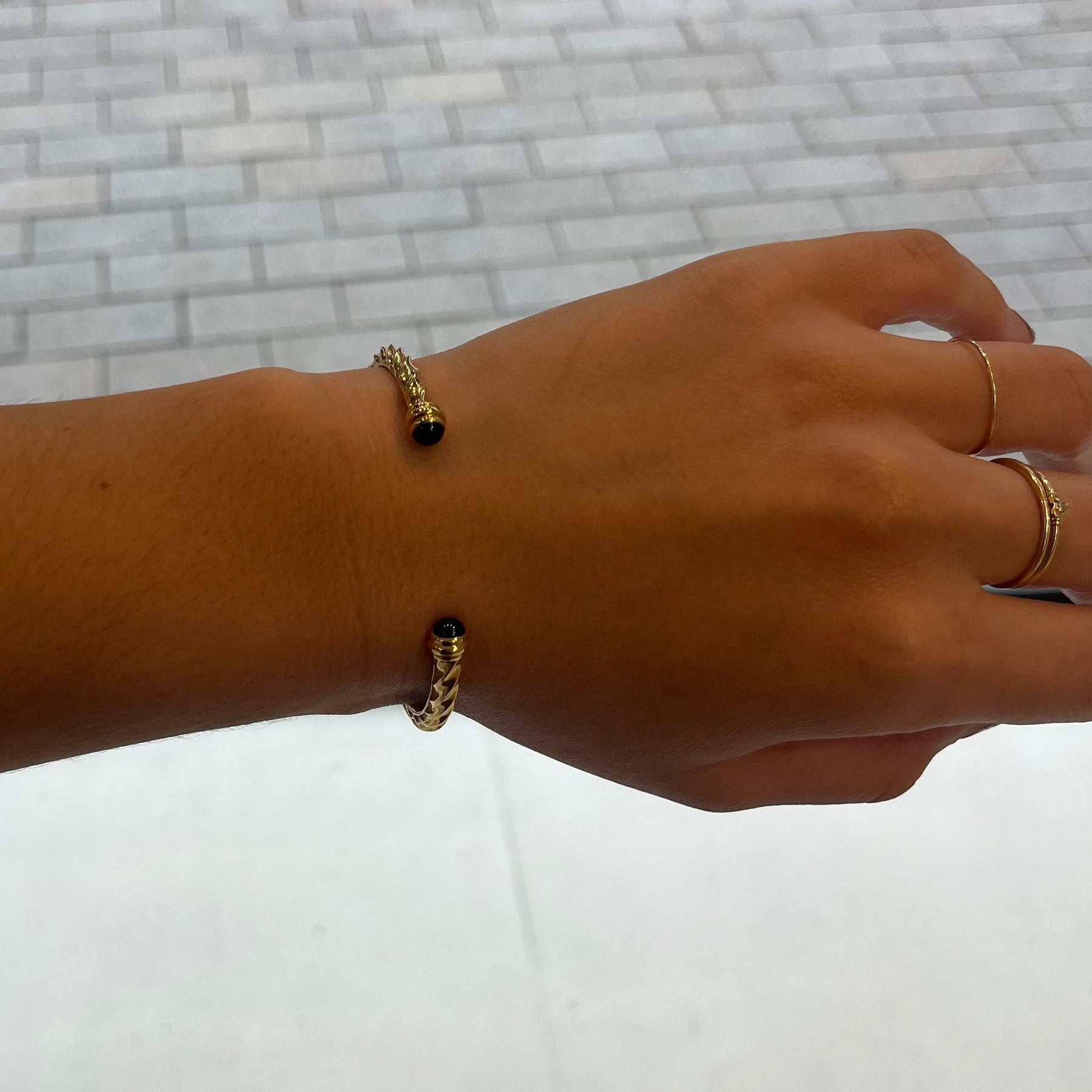 The smooth domes of the black onyx cabochon terminals allow this regal cuff to slide on with ease.