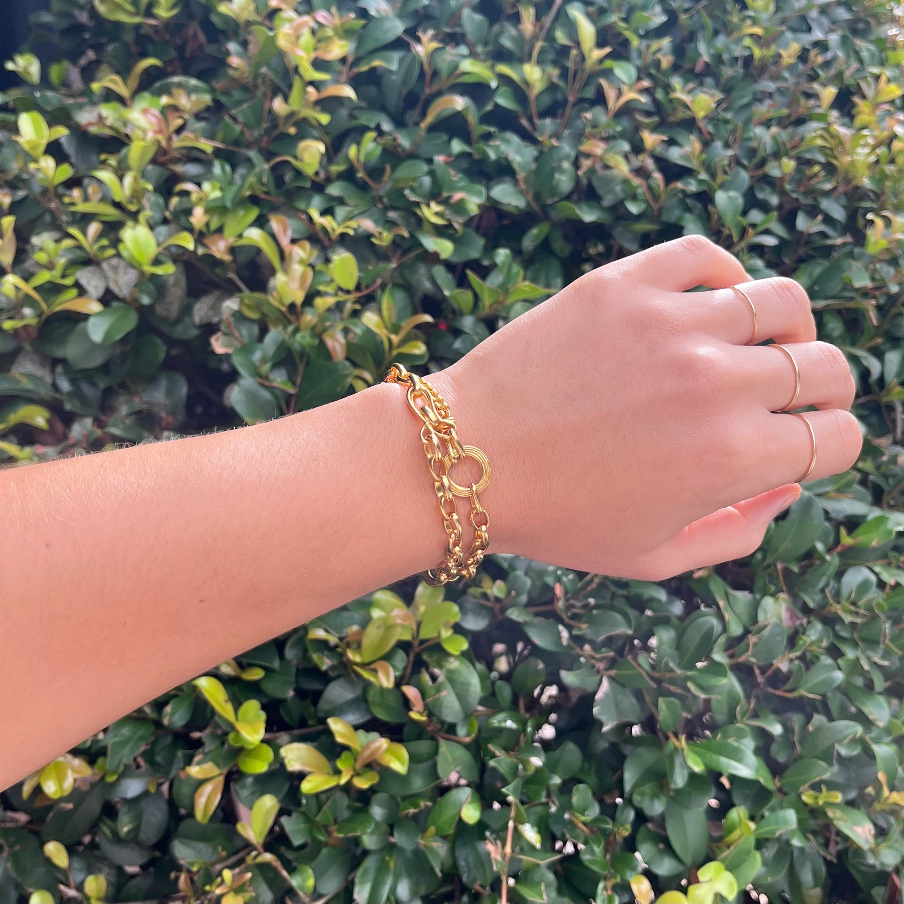 A multi-layered 18k gold vermeil bracelet that contrasts a curb chain with an oval rollo chain, creating depth and texture.