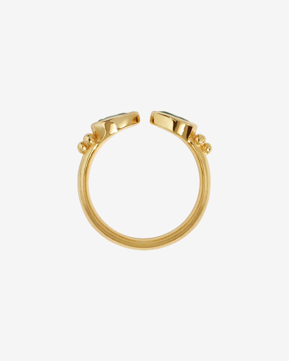 Crafted from 18k gold vermeil, this open band ring features two pear-shaped green peridot gemstones, accented by a trio of gold beading.